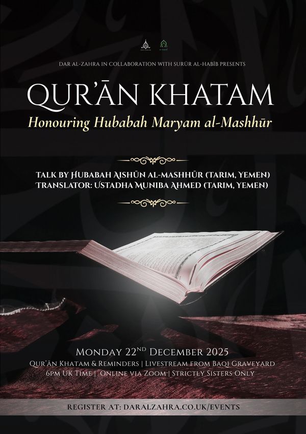 Join us for a Qur’ān Khatam in honour of our beloved teacher, Hubabah Maryam al-Mashhūr. For those who have taken a juz, please note that the khatam will be held earlier than stated on the link. Kindly ensure that all recitation is completed by 6:00 pm (UK time) on Monday.